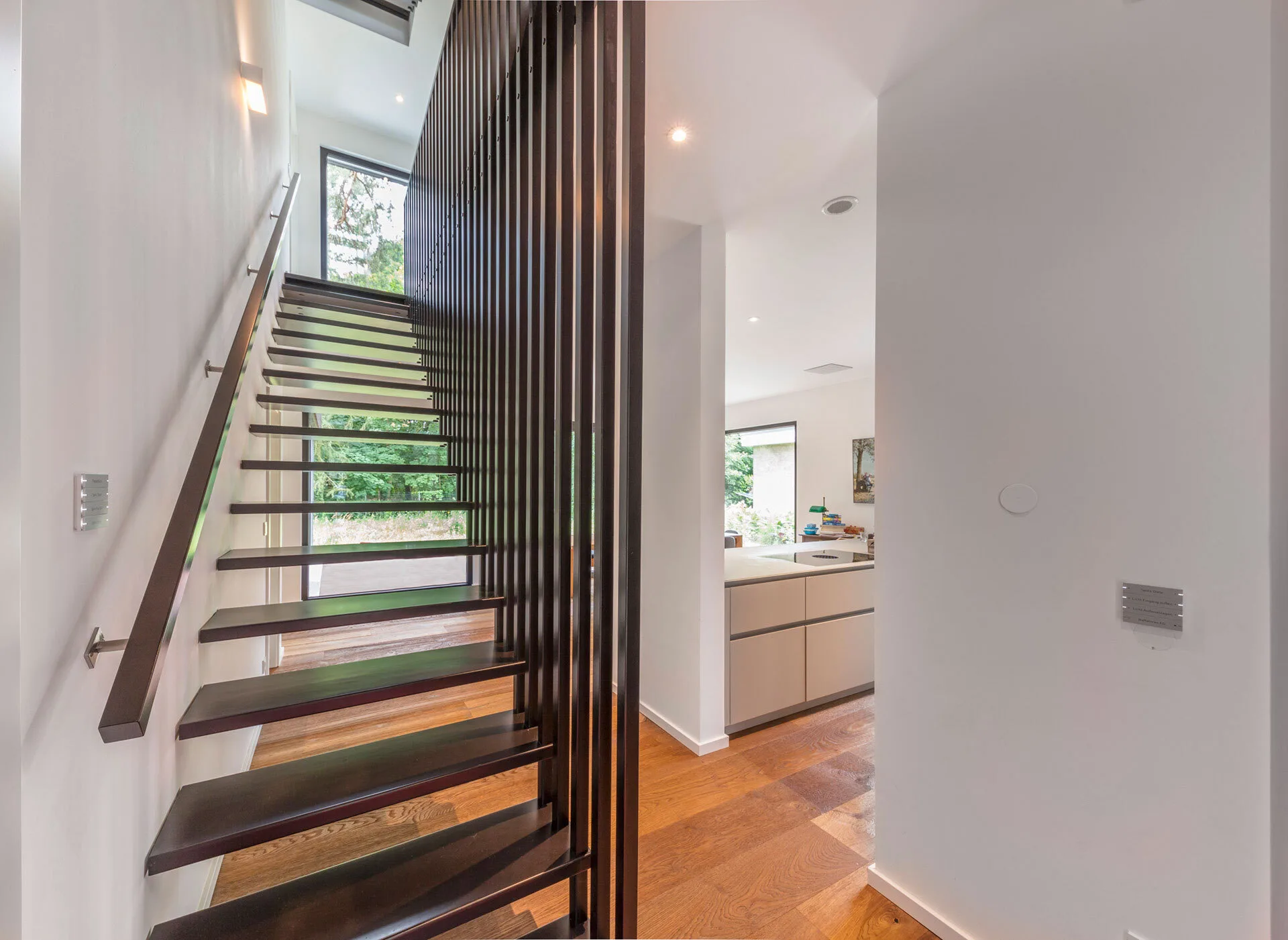 A stylish dark brown staircase, which matches the wooden facade perfectly, leads to the first floor. Here there are two cosy children's bedrooms, a modern bathroom, a relaxing sauna and the spacious master bedroom with adjoining dressing room.