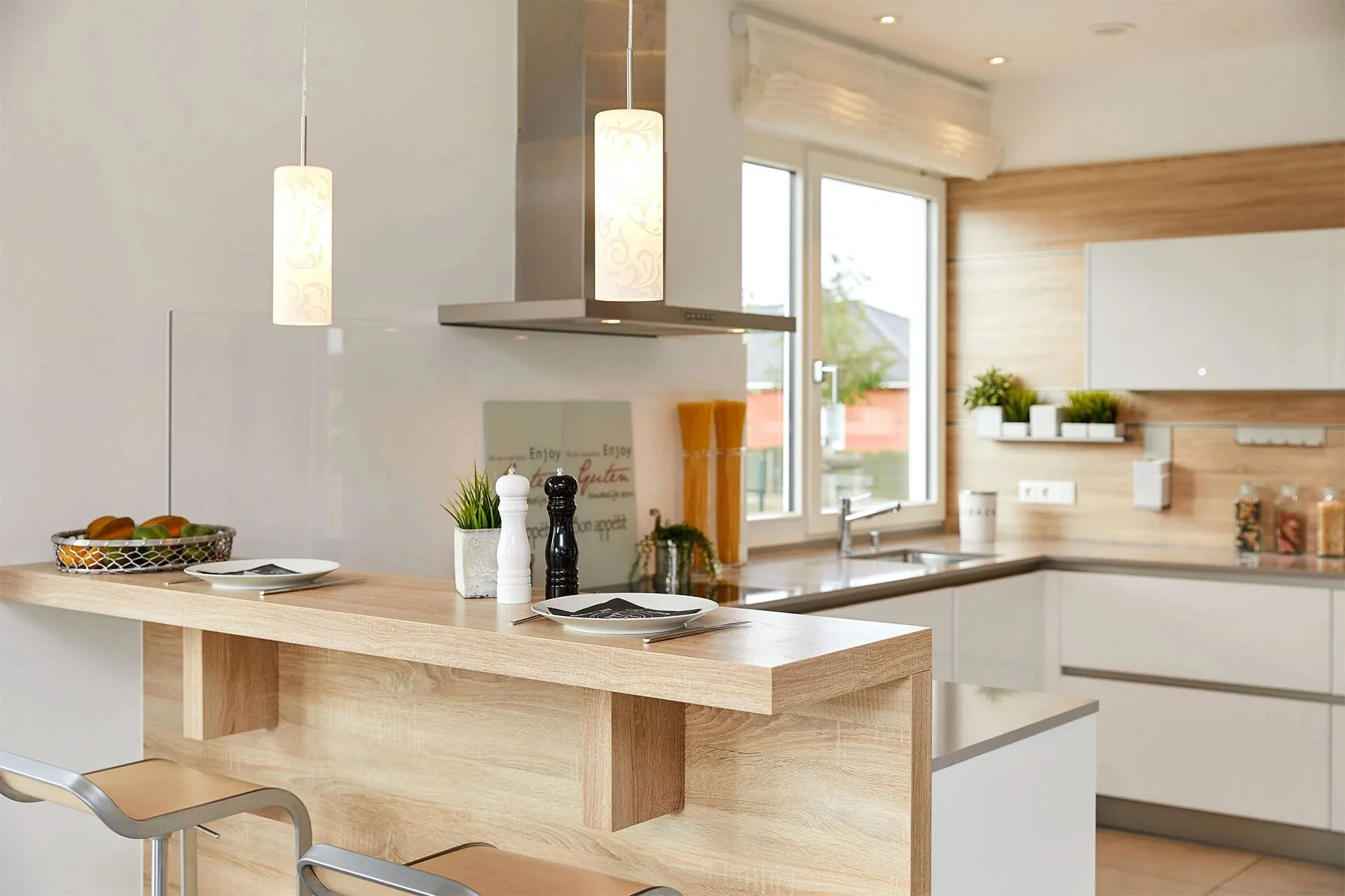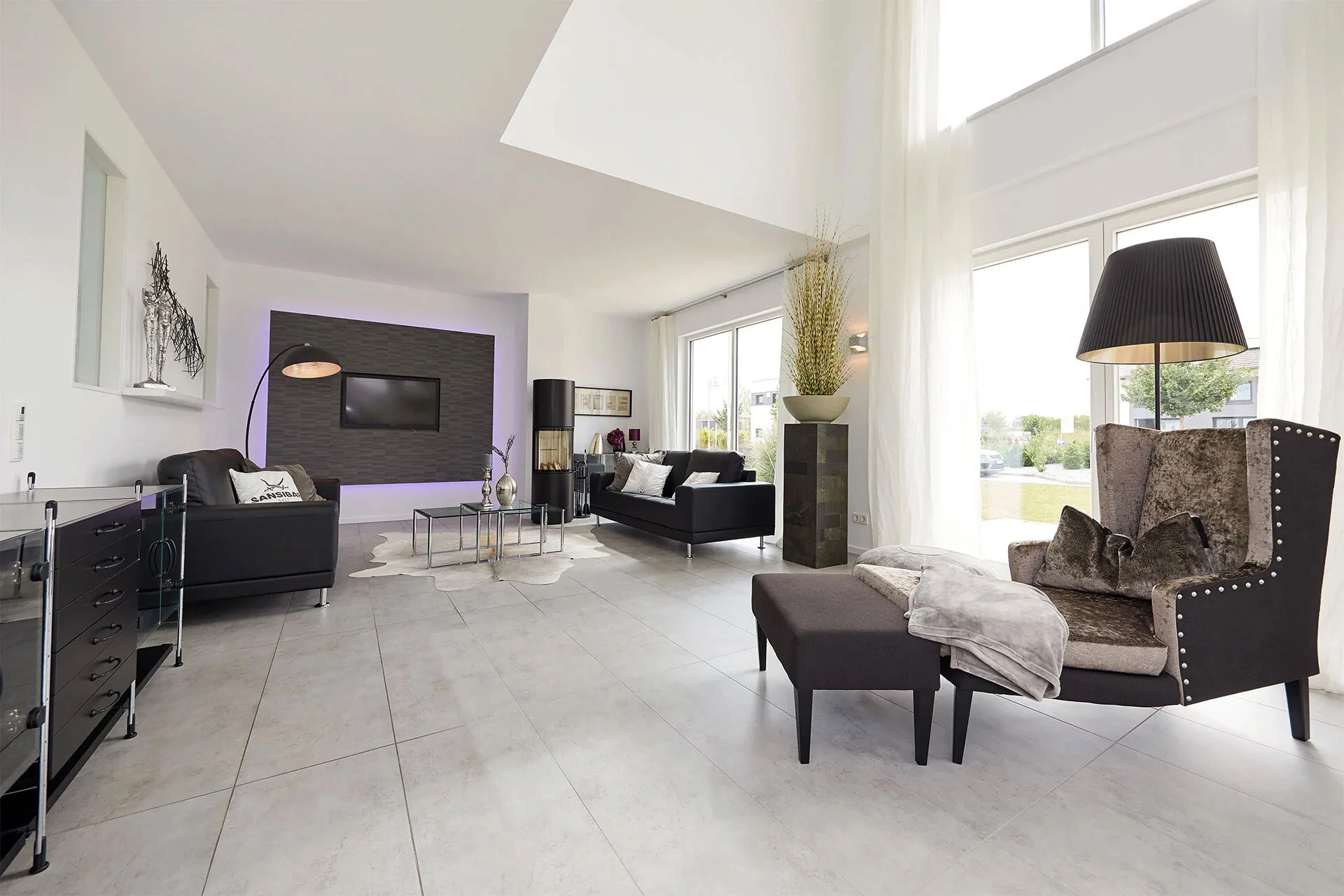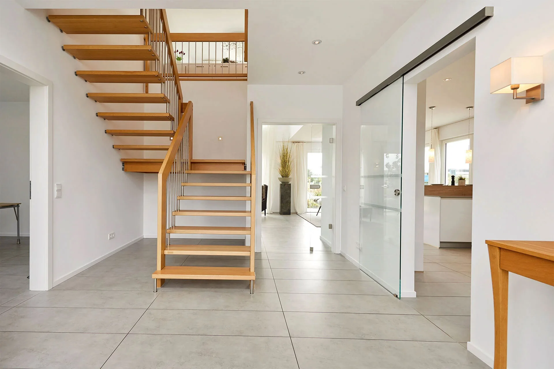 The transparency and lightness of the open gallery with floor-to-ceiling windows and glass elements, and the masterfully crafted staircase, are striking from the moment you enter the show home. The L-shaped living/dining area with open plan kitchen runs the full width of the house and is the highlight of the ground floor. The space is complemented by a separate study, a cleverly integrated cloakroom and a guest toilet with shower. From the gallery on the upper floor you can overlook the hallway or the living room. Two children's bedrooms with an ensuite shower room and a spacious master bedroom with a separate luxury bathroom complete the almost 204 square metre space.