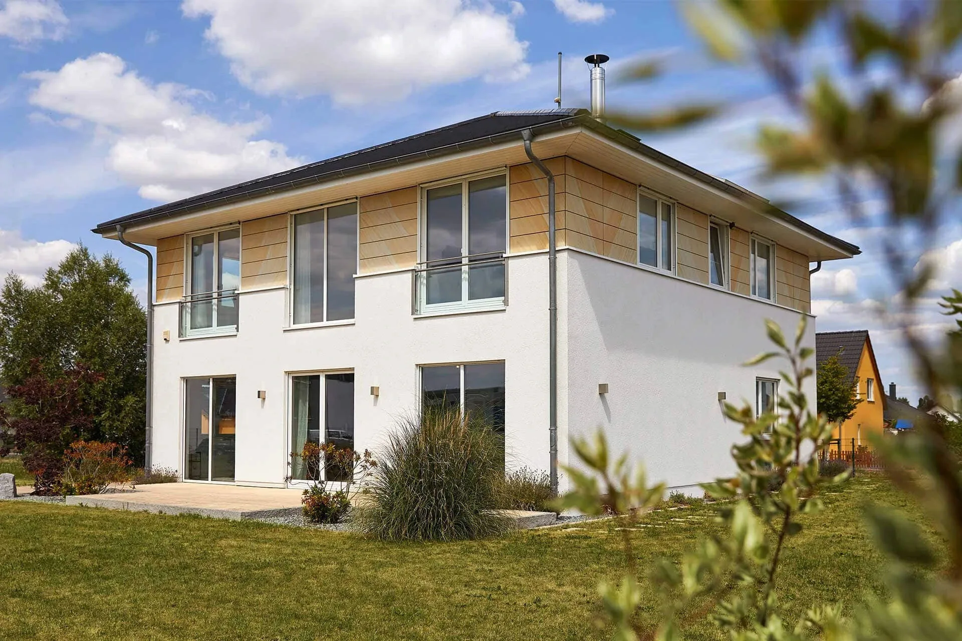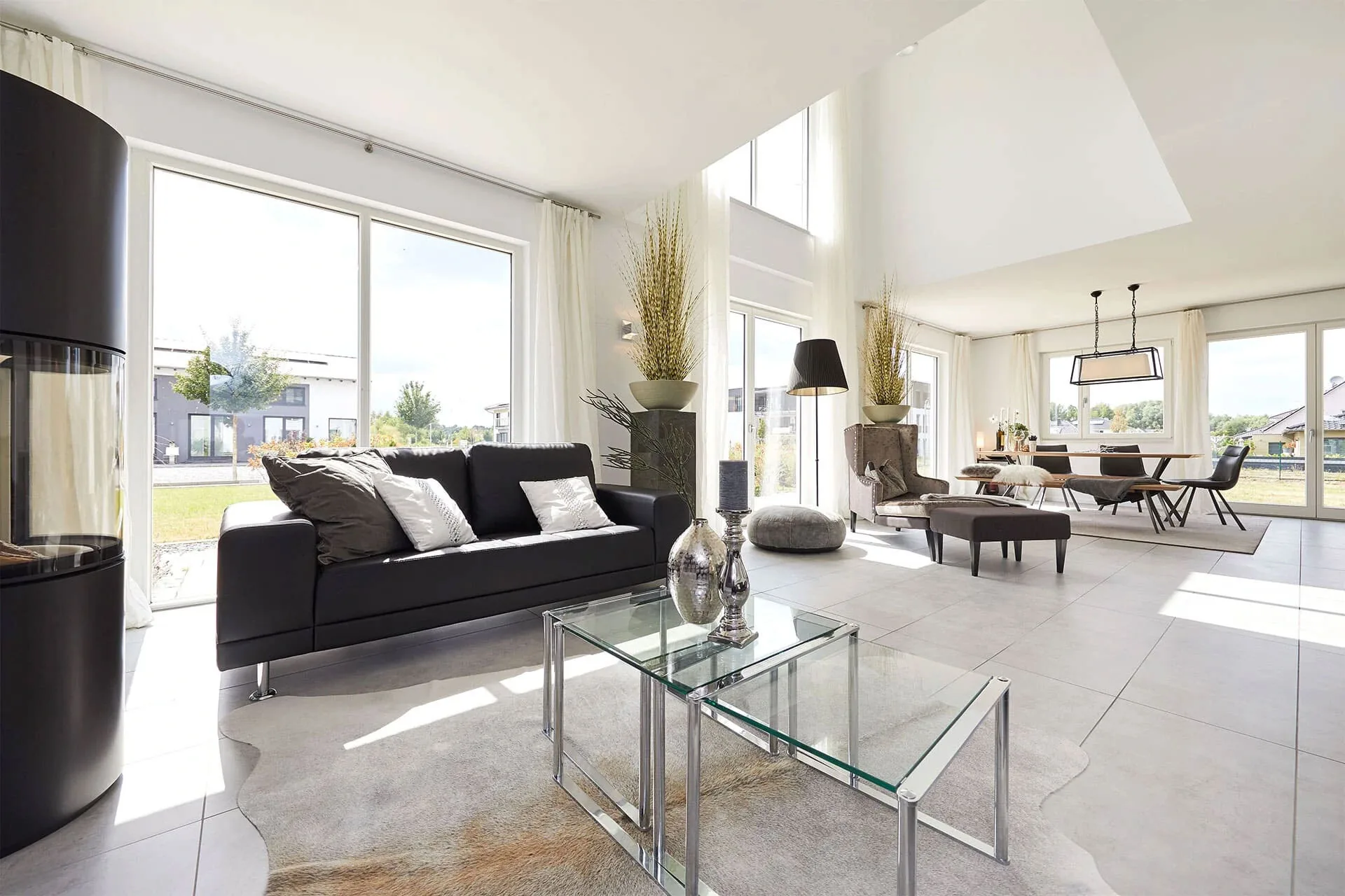 The 'Stadtvilla Werder' show home in Berlin's Unger Park is impressive from every angle: on the outside, the mixed facade gives the house an elegant and understated charm. Inside, floor-to-ceiling glazing and an open gallery are impressive. Floor-to-ceiling windows ensure that the spacious living areas are flooded with natural light. A compact structure on a square footprint and a cantilevered tent roof characterise the simple design and unmistakable charm.