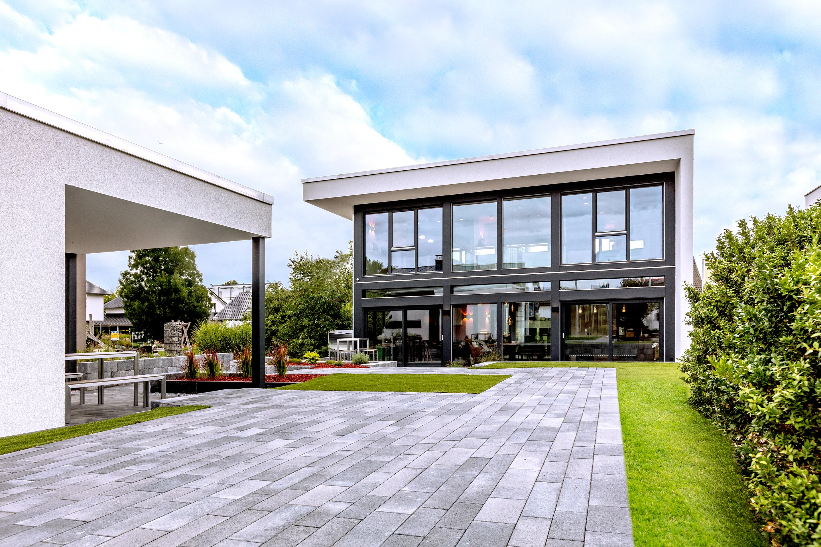 The architectural idea of the show house "FUSION" in the German Off-Site Manufactured House Center Mannheim combines design elements of modern Bauhaus architecture with the popular post and beam construction of the Meisterstueck-HAUS "AESTHETIK" houses.